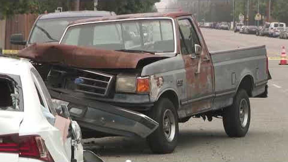 Opp say a transport truck. One person died and two others were injured. Firemen washing down cars to prevent fire at Avalon Boulevard and Manchester.